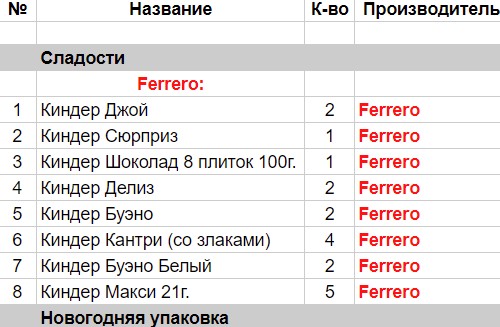 Киндер Джой (3 шт), Киндер Шоколад 8 плиток 100г. (1 шт), Киндер Делис (2 шт), Киндер Буэно (2 шт), Киндер Кантри (со злаками) (2 шт), Киндер Бонс (2 шт), Киндер Макси 21 г. (5 шт)